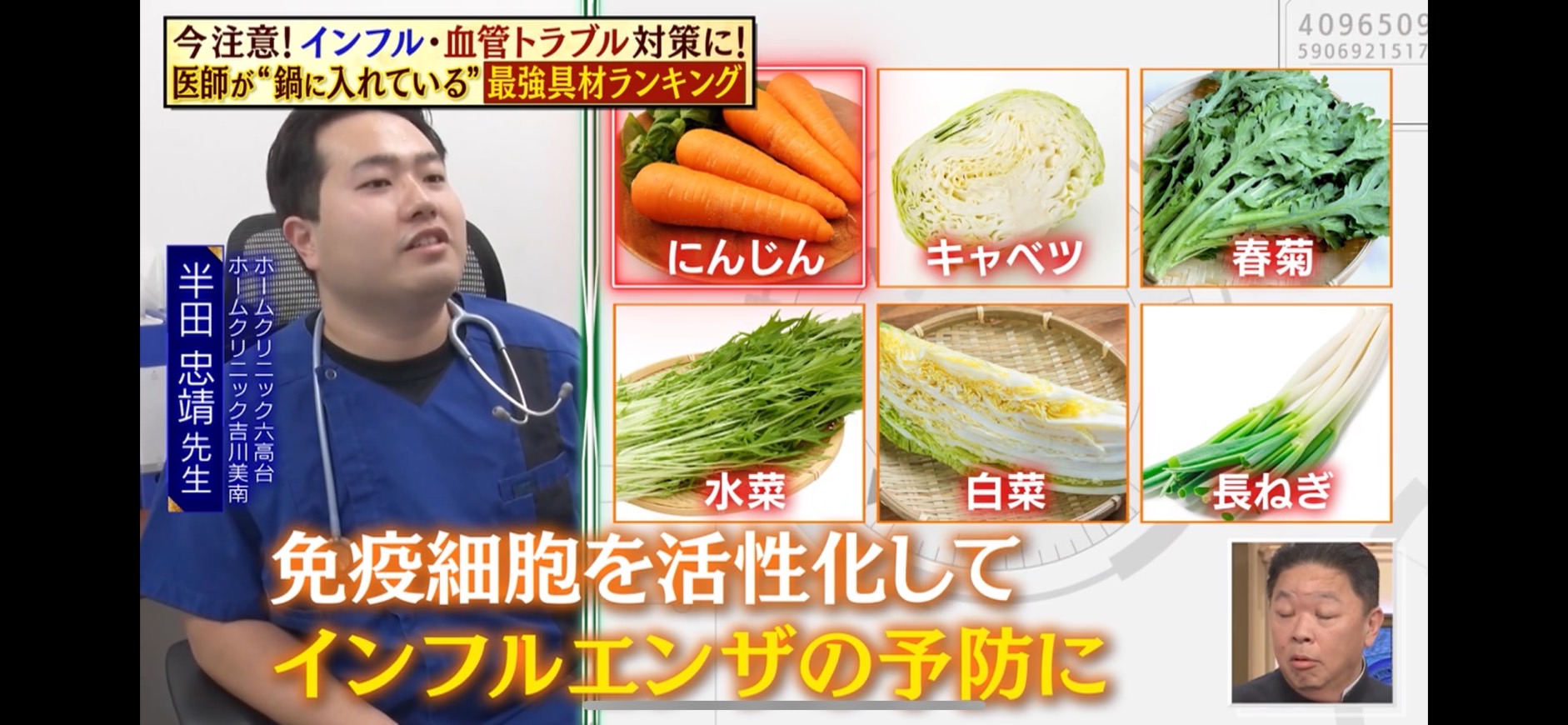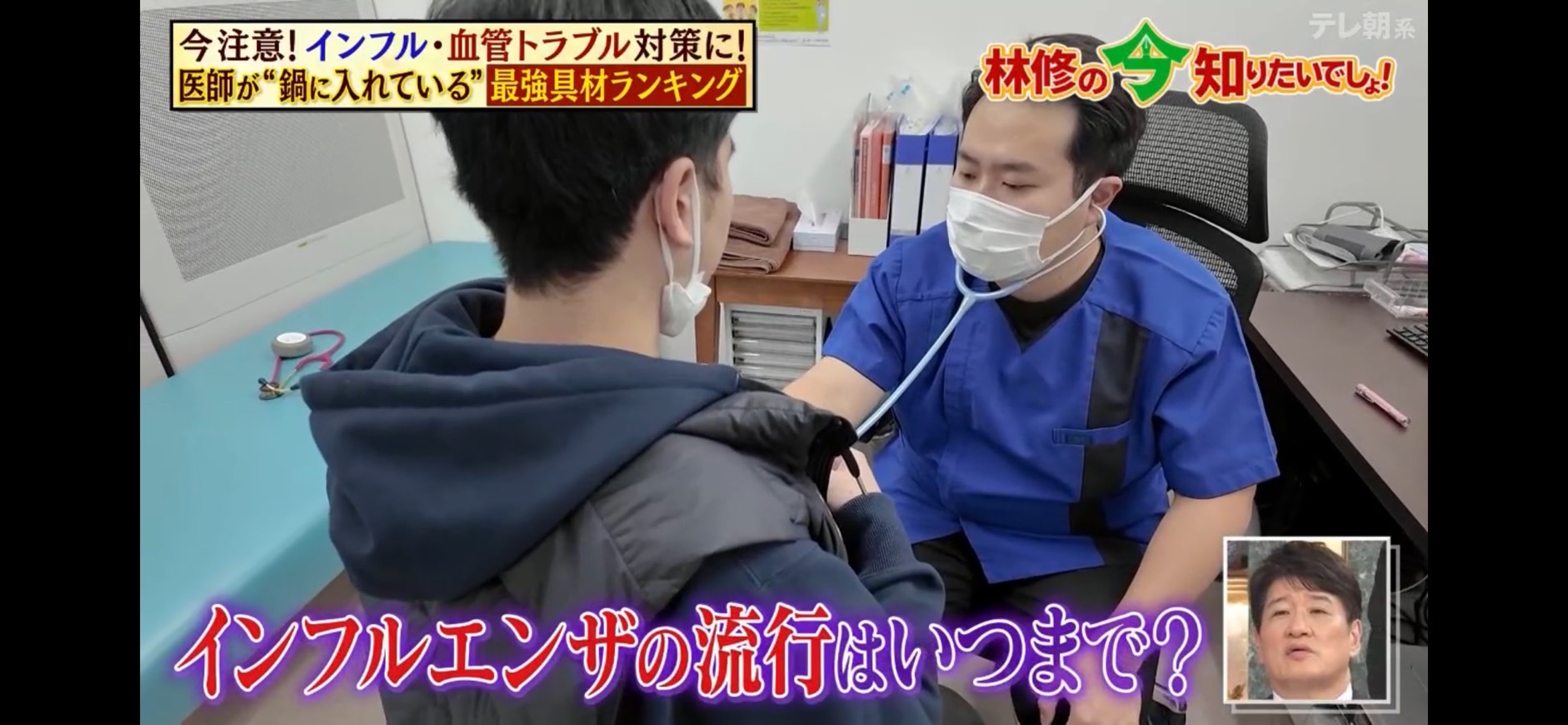 テレビ朝日「林修の今知りたいでしょ!」に出演しました2025.12.122025年12月4日(木)放送のテレビ朝日 「林修の今知りたいでしょ!」 に、当院の院長が専門家として出演いたしました。 番組内では「医師が”鍋に入れている”最強具材ランキング」に関連して、日々の健康づくりや食生活の工夫について解説を行いました。当院では、テレビで紹介された内容をはじめ、皆さまの健康をサポートするための最新の知見を活かした診療を行っております。 ぜひお気軽にご相談ください。 Tweet Share Hatena Pocket RSS feedly Pin it この記事のタイトルとURLをコピーする 冬季休業のお知らせ前の記事